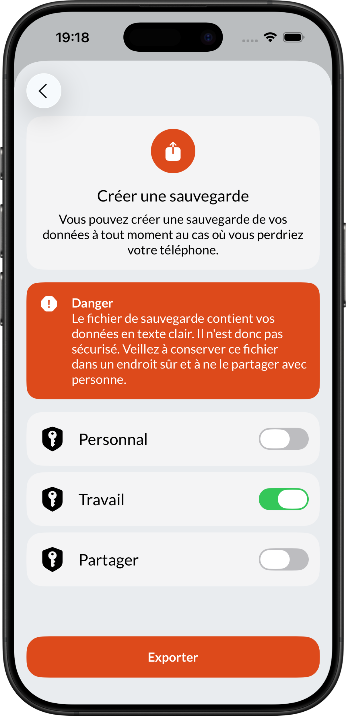 Creating a new backup couldn’t be easier with Brennus OTP. To do so, simply go to Settings > Create a backup.