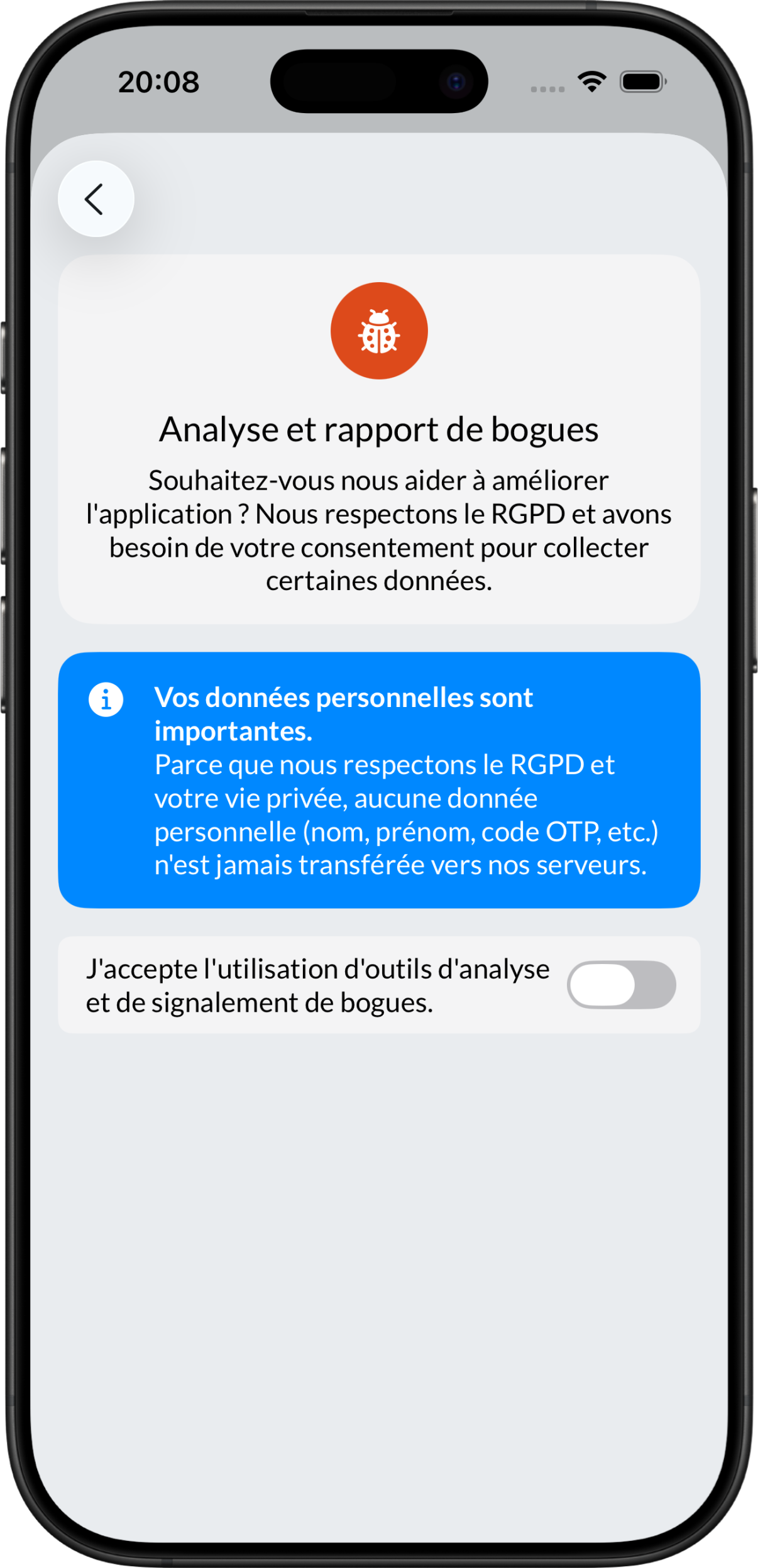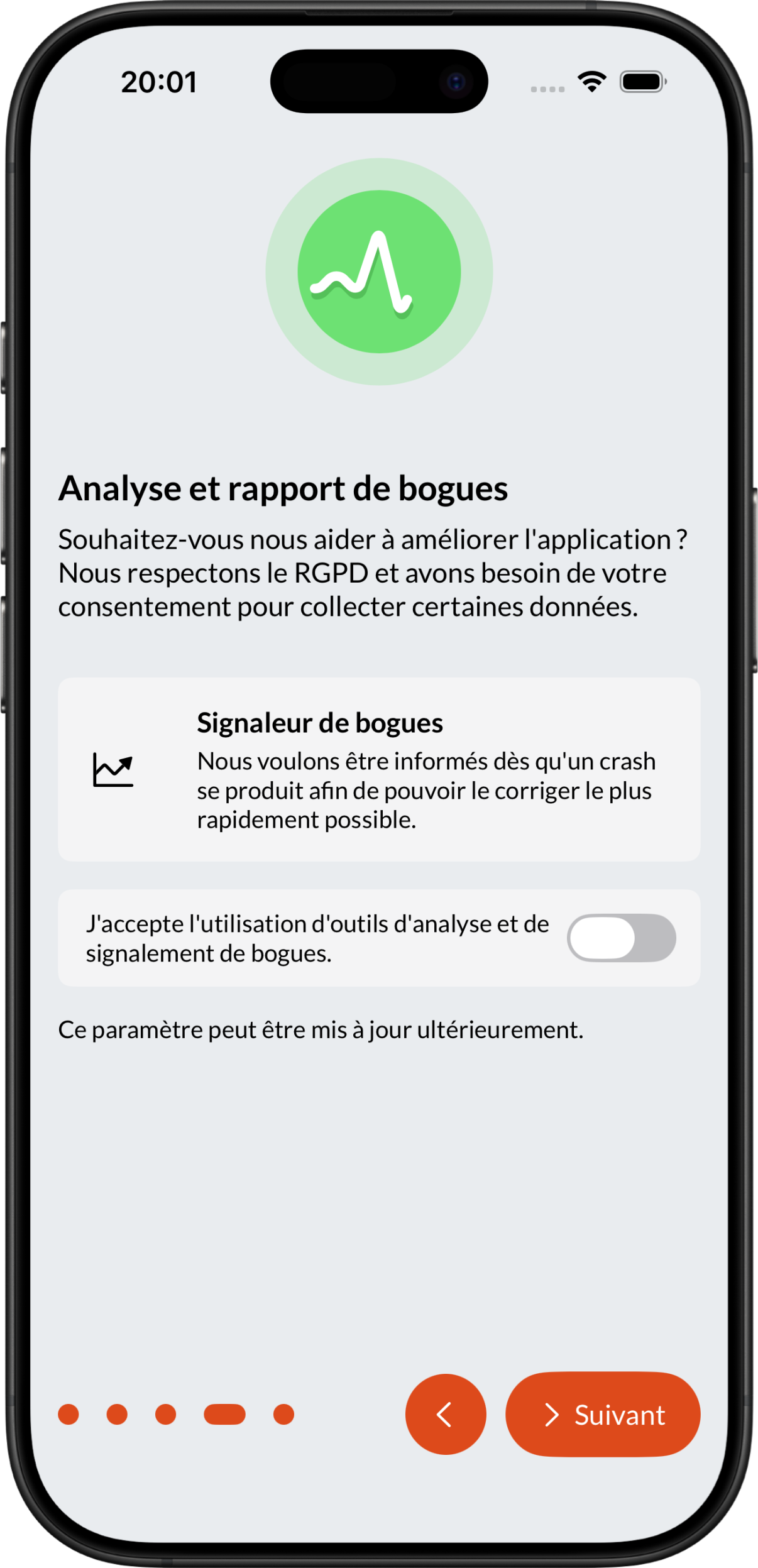 As soon as you onboard the application, you have the option to activate the bug reporter. By default, it is not activated.