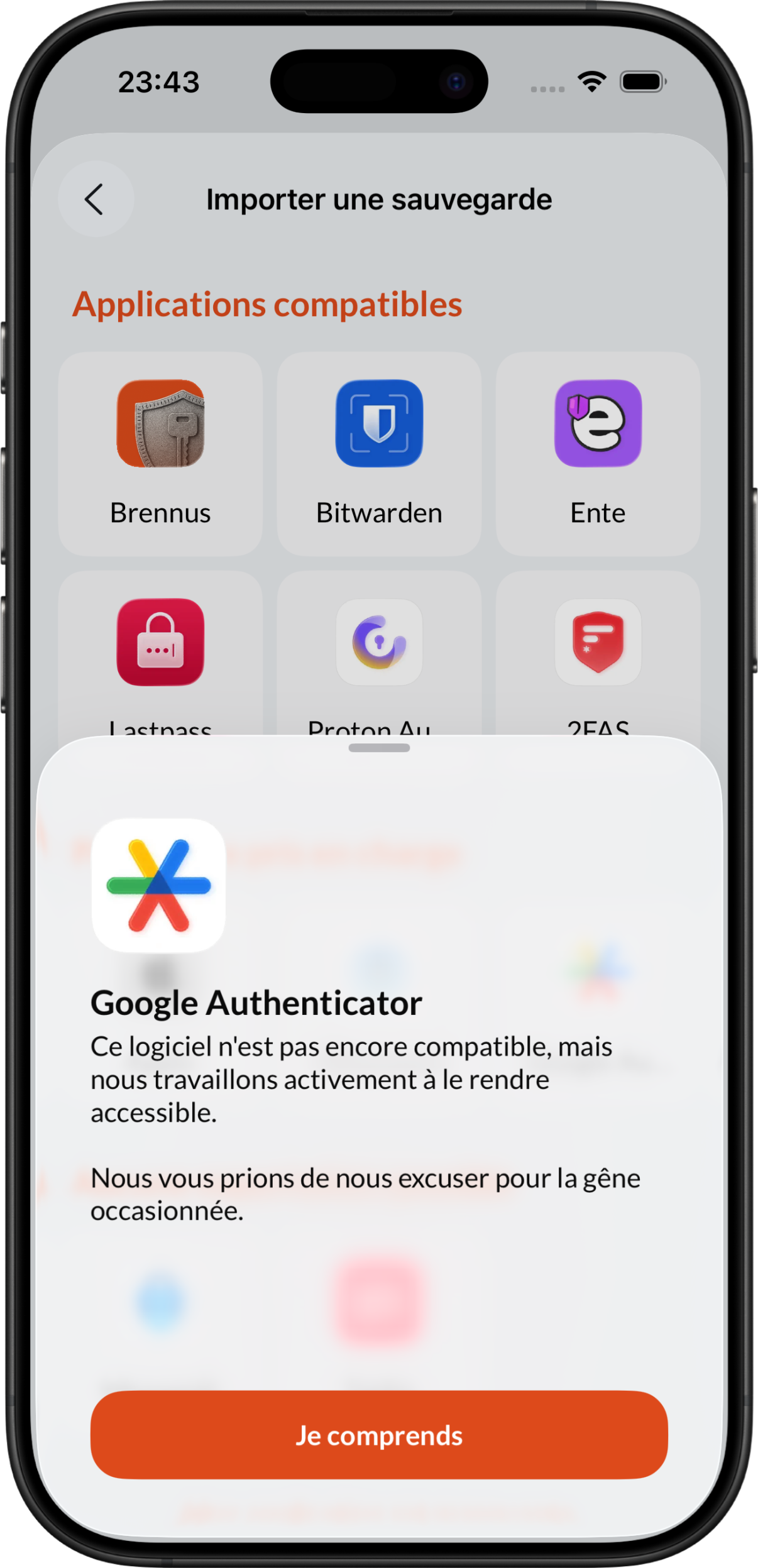The Google Authenticator application supports data export. However, Brennus OTP does not yet support this format. We apologize for the inconvenience. We are actively working on supporting this new format.